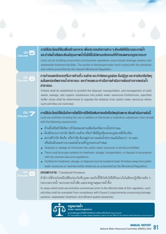 5678Land use for building construction and business operations must include drainage systems and wastewater treatment facilities. The quality of discharged water must comply with the standards and criteria prescribed by the relevant Ministerial Regulation.%u0e01%u0e32%u0e23%u0e43%u0e0a%u0e49%u0e49%u0e1b%u0e23%u0e30%u0e42%u0e22%u0e0a%u0e19%u0e4c%u0e4c%u0e17%u0e35%u0e48%u0e48%ufffd%u0e14%u0e34%u0e34%u0e19%u0e40%u0e1e%u0e37%u0e48%u0e48%ufffd%u0e2d%u0e2a%u0e23%u0e49%u0e49%u0e32%u0e07%u0e2d%u0e32%u0e04%u0e32%u0e23 %u0e40%u0e1e%u0e37%u0e48%u0e48%ufffd%u0e2d%u0e1b%u0e23%u0e30%u0e01%u0e2d%u0e1a%u0e01%u0e34%u0e34%u0e08%u0e01%u0e32%u0e23%u0e15%u0e48%u0e48%u0e32%u0e07 %u0e46 %u0e15%u0e49%u0e49%u0e2d%u0e07%u0e08%u0e31%u0e31%u0e14%u0e43%u0e2b%u0e49%u0e49%u0e21%u0e35%u0e35%u0e23%u0e30%u0e1a%u0e1a%u0e23%u0e30%u0e1a%u0e32%u0e22%u0e19%u0e49%u0e49%u0e33 %u0e41%u0e25%u0e30%u0e1a%u0e33%u0e1a%u0e31%u0e31%u0e14%u0e19%u0e49%u0e49%u0e33%u0e40%u0e2a%u0e35%u0e35%u0e22%u0e41%u0e25%u0e30%u0e15%u0e49%u0e49%u0e2d%u0e07%u0e21%u0e35%u0e35%u0e04%u0e38%u0e38%u0e13%u0e20%u0e32%u0e1e%u0e19%u0e49%u0e49%u0e33%u0e17%u0e34%u0e49%u0e49%ufffd%u0e07%u0e43%u0e2b%u0e49%u0e49%u0e40%u0e1b%u0e47%u0e47%u0e19%u0e44%u0e1b%u0e15%u0e32%u0e21%u0e2b%u0e25%u0e31%u0e31%u0e01%u0e40%u0e01%u0e13%u0e11%u0e4c%u0e4c%u0e17%u0e35%u0e48%u0e48%ufffd%u0e01%u0e33%u0e2b%u0e19%u0e14%u0e15%u0e32%u0e21%u0e01%u0e0e%u0e01%u0e23%u0e30%u0e17%u0e23%u0e27%u0e07%u0e2f%u0e01%u0e32%u0e23%u0e01%u0e33%u0e2b%u0e19%u0e14%u0e2b%u0e25%u0e31%u0e31%u0e01%u0e40%u0e01%u0e13%u0e11%u0e4c%u0e4c%u0e43%u0e19%u0e01%u0e32%u0e23%u0e2b%u0e49%u0e49%u0e32%u0e21%u0e17%u0e34%u0e49%u0e49%ufffd%u0e07 %u0e02%u0e19%u0e22%u0e49%u0e49%u0e32%u0e22 %u0e41%u0e25%u0e30%u0e01%u0e33%u0e08%u0e31%u0e31%u0e14%u0e02%u0e22%u0e30%u0e21%u0e39%u0e39%u0e25%u0e1d%u0e2d%u0e22 %u0e2a%u0e34%u0e48%u0e48%ufffd%u0e07%u0e1b%u0e0f%u0e34%u0e34%u0e01%u0e39%u0e39%u0e25 %u0e41%u0e25%u0e30%u0e2a%u0e32%u0e23%u0e2d%u0e34%u0e34%u0e19%u0e17%u0e23%u0e35%u0e35%u0e22%u0e27%u0e31%u0e31%u0e15%u0e16%u0e38%u0e38 %u0e25%u0e07%u0e43%u0e19%u0e41%u0e2b%u0e25%u0e48%u0e48%u0e07%u0e17%u0e23%u0e31%u0e31%u0e1e%u0e22%u0e32%u0e01%u0e23%u0e19%u0e49%u0e49%u0e33%u0e2a%u0e32%u0e18%u0e32%u0e23%u0e13%u0e30 %u0e41%u0e25%u0e30%u0e01%u0e33%u0e2b%u0e19%u0e14%u0e23%u0e30%u0e22%u0e30%u0e2b%u0e48%u0e48%u0e32%u0e07%u0e43%u0e19%u0e01%u0e32%u0e23%u0e14%u0e33%u0e40%u0e19%u0e34%u0e34%u0e19%u0e01%u0e32%u0e23%u0e14%u0e31%u0e31%u0e07%u0e01%u0e25%u0e48%u0e48%u0e32%u0e27%u0e08%u0e32%u0e01%u0e41%u0e2b%u0e25%u0e48%u0e48%u0e07%u0e19%u0e49%u0e49%u0e33%u0e2a%u0e32%u0e18%u0e32%u0e23%u0e13%u0e30%u0e1a%u0e17%u0e40%u0e09%u0e1e%u0e32%u0e30%u0e01%u0e32%u0e25 : Transitional Provisions%u0e01%u0e32%u0e23%u0e43%u0e0a%u0e49%u0e49%u0e1b%u0e23%u0e30%u0e42%u0e22%u0e0a%u0e19%u0e4c%u0e4c%u0e17%u0e35%u0e48%u0e48%ufffd%u0e14%u0e34%u0e34%u0e19%u0e43%u0e19%u0e01%u0e34%u0e34%u0e08%u0e01%u0e32%u0e23%u0e43%u0e14%u0e17%u0e35%u0e48%u0e48%ufffd%u0e21%u0e35%u0e35%u0e01%u0e32%u0e23%u0e43%u0e0a%u0e49%u0e49%u0e2b%u0e23%u0e37%u0e37%u0e2d%u0e40%u0e15%u0e34%u0e34%u0e21%u0e2a%u0e32%u0e23%u0e40%u0e04%u0e21%u0e35%u0e35%u0e2b%u0e23%u0e37%u0e37%u0e2d%u0e27%u0e31%u0e31%u0e15%u0e16%u0e38%u0e38%u0e2d%u0e31%u0e31%u0e19%u0e15%u0e23%u0e32%u0e22 %u0e15%u0e49%u0e49%u0e2d%u0e07%u0e14%u0e33%u0e40%u0e19%u0e34%u0e34%u0e19%u0e01%u0e32%u0e23%u0e14%u0e31%u0e31%u0e07%u0e19%u0e35%u0e49%u0e49%ufffd%u25cf%u0e2b%u0e49%u0e49%u0e32%u0e21%u0e17%u0e34%u0e49%u0e49%u0e07%u0e2b%u0e23%u0e37%u0e37%u0e2d%u0e17%u0e33%u0e43%u0e2b%u0e49%u0e49%u0e40%u0e01%u0e34%u0e34%u0e14%u0e01%u0e32%u0e23%u0e23%u0e31%u0e48%u0e48%ufffd%u0e27%u0e44%u0e2b%u0e25%u0e02%u0e2d%u0e07%u0e2a%u0e32%u0e23%u0e40%u0e04%u0e21%u0e35%u0e35%u0e25%u0e07%u0e43%u0e19%u0e17%u0e23%u0e31%u0e31%u0e1e%u0e22%u0e32%u0e01%u0e23%u0e19%u0e49%u0e49%u0e33%u0e2a%u0e32%u0e18%u0e32%u0e23%u0e13%u0e30%u25cf%u0e15%u0e49%u0e49%u0e2d%u0e07%u0e21%u0e35%u0e35%u0e23%u0e30%u0e1a%u0e1a%u0e01%u0e32%u0e23%u0e1a%u0e33%u0e1a%u0e31%u0e31%u0e14 %u0e08%u0e31%u0e31%u0e14%u0e40%u0e01%u0e47%u0e47%u0e1a %u0e02%u0e19%u0e22%u0e49%u0e49%u0e32%u0e22%u0e2b%u0e23%u0e37%u0e37%u0e2d%u0e01%u0e33%u0e08%u0e31%u0e31%u0e14%u0e43%u0e2b%u0e49%u0e49%u0e16%u0e39%u0e39%u0e01%u0e15%u0e49%u0e49%u0e2d%u0e07%u0e15%u0e32%u0e21%u0e01%u0e0e%u0e2b%u0e21%u0e32%u0e22%u0e17%u0e35%u0e48%u0e48%ufffd%u0e40%u0e01%u0e35%u0e48%u0e48%ufffd%u0e22%u0e27%u0e02%u0e49%u0e49%u0e2d%u0e07%u25cf%u0009 %u0e2a%u0e16%u0e32%u0e19%u0e17%u0e35%u0e48%u0e48%ufffd%u0e1a%u0e33%u0e1a%u0e31%u0e31%u0e14 %u0e08%u0e31%u0e31%u0e14%u0e40%u0e01%u0e47%u0e47%u0e1a %u0e2b%u0e23%u0e37%u0e37%u0e2d%u0e01%u0e33%u0e08%u0e31%u0e31%u0e14 %u0e15%u0e49%u0e49%u0e2d%u0e07%u0e2d%u0e22%u0e39%u0e48%u0e48%u0e2b%u0e48%u0e48%u0e32%u0e07%u0e08%u0e32%u0e01%u0e41%u0e2b%u0e25%u0e48%u0e48%u0e07%u0e19%u0e49%u0e49%u0e33%u0e2a%u0e32%u0e18%u0e32%u0e23%u0e13%u0e30%u0e44%u0e21%u0e48%u0e19%u0e49%u0e49%u0e2d%u0e22%u0e01%u0e27%u0e48%u0e48%u0e3210%u0e40%u0e21%u0e15%u0e23 %u0e2b%u0e23%u0e37%u0e37%u0e2d%u0e15%u0e49%u0e49%u0e2d%u0e07%u0e21%u0e35%u0e35%u0e23%u0e30%u0e22%u0e30%u0e2b%u0e48%u0e48%u0e32%u0e07%u0e08%u0e32%u0e01%u0e41%u0e2b%u0e25%u0e48%u0e48%u0e07%u0e19%u0e49%u0e49%u0e33%u0e15%u0e32%u0e21%u0e17%u0e35%u0e48%u0e48%ufffd%u0e01%u0e0e%u0e01%u0e23%u0e30%u0e17%u0e23%u0e27%u0e07%u0e01%u0e33%u0e2b%u0e19%u0e14Criteria shall be established to prohibit the disposal, transportation, and management of solid waste, sewage, and organic substances into public water resources.Furthermore, specified buffer zones shall be determined to regulate the distance from public water resources where such activities are restricted.%u25cf Disposal or leakage of chemicals into public water resources is strictly prohibited.%u25cf There must be proper systems for treatment, storage, transportation, or disposal in accordance with the relevant laws and regulations.%u25cf Facilities for treatment, storage, or disposal must be located at least 10 meters away from public water resources or maintain buffer distances as prescribed by the Ministerial Regulation.In cases where land use activities commenced prior to the effective date of this regu