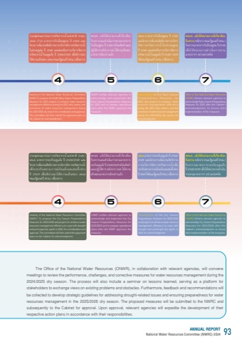 45674567The Office of the National Water Resources (ONWR), in collaboration with relevant agencies, will convenemeetings to review the performance, challenges, and corrective measures for water resources management during the 2024/2025 dry season. The process will also include a seminar on lessons learned, serving as a platform for stakeholders to exchange views on existing problems and obstacles. Furthermore, feedback and recommendations will be collected to develop strategic guidelines for addressing drought-related issues and ensuring preparedness for waterresources management in the 2025/2026 dry season. The proposed measures will be submitted to the NWRC and subsequently to the Cabinet for approval. Upon approval, relevant agencies will expedite the development of their respective action plans in accordance with their responsibilities.45674567Meeting of the National Water Resources Committee (NWRC) To propose the Dry Season Preparedness Measures for 2025/2026 and projects to enhance water resources management efficiency to cope with drought and prolonged dry spells in 2026, for consideration and approval. The committee will then submit the approved plans to the Cabinet for acknowledgment.ONWR notifies relevant agencies to acknowledge and implement the Dry Season Preparedness Measures for2025/2026 and to prepare operational plans after the NWRC approves the measures.Presentation of the Dry Season Preparedness Measures for 2025/2026 and projects to enhance water resourcemanagement efficiency to cope with drought and prolonged dry spells in 2026 for acknowledgment.Office of the National Water Resources (ONWR) informs relevant agencies to acknowledge Dry Season Preparedness Measures for 2025/2026 after theCabinet%u2019s acknowledgment, to ensure strict implementation of the measures.Meeting of the National Water Resources Committee (NWRC) To propose the (draft) Rainy Season Preparedness Measures for 2025, projects to enhance water resources management efficiency during the 2025 rainy season, and promotion of water resources management during the 2025/2026 dry season for consideration and approval. The committee will then submit the approved plans to the Cabinet for acknowledgment.ONWR notifies relevant agencies to acknowledge and implement the Rainy Season Preparedness Measures for 2025 and to prepare operational plans after the NWRC approves the measures.Presentation of the Rainy SeasonPreparedness M e a s u r e s f o r 2025, the project to enhance water resource management efficiency during the 2025 rainy season, and the promotion of water resource managementduring the 2025/2026 dry season for acknowledgment.Office of the National Water Resources (ONWR) informs relevant agencies to acknowledge Rainy Season Preparedness Measures for 2025 after the Cabinet%u2019s acknowledgment, to ensure strict implementation of the measures.%u0e1b%u0e23%u0e30%u0e0a%u0e38%u0e38%u0e21%u0e04%u0e13%u0e30%u0e01%u0e23%u0e23%u0e21%u0e01%u0e32%u0e23%u0e17%u0e23%u0e31%u0e31%u0e1e%u0e22%u0e32%u0e01%u0e23%u0e19%u0e49%u0e49%u0e33%u0e41%u0e2b%u0e48%u0e48%u0e07%u0e0a%u0e32%u0e15%u0e34%u0e34 (%u0e01%u0e19%u0e0a.) %u0e40%u0e2a%u0e19%u0e2d (%u0e23%u0e48%u0e48%u0e32%u0e07) %u0e21%u0e32%u0e15%u0e23%u0e01%u0e32%u0e23%u0e23%u0e31%u0e31%u0e1a%u0e21%u0e37%u0e37%u0e2d%u0e24%u0e14%u0e39%u0e39%u0e1d%u0e19%u0e1b%u0e35%u0e35 2568 %u0e41%u0e25%u0e30%u0e42%u0e04%u0e23%u0e07%u0e01%u0e32%u0e23%u0e40%u0e1e%u0e34%u0e48%u0e48%u0e21%u0e1b%u0e23%u0e30%u0e1e%u0e34%u0e48%u0e48%u0e2a%u0e34%u0e17%u0e18%u0e34%u0e34%u0e20%u0e32%u0e1e%u0e01%u0e32%u0e23%u0e1a%u0e34%u0e23%u0e34%u0e2b%u0e34%u0e32%u0e23%u0e08%u0e31%u0e31%u0e14%u0e01%u0e32%u0e23%u0e17%u0e23%u0e31%u0e1e%u0e22%u0e32%u0e01%u0e23%u0e19%u0e49%u0e49%u0e33%u0e31%u0e43%u0e19%u0e0a%u0e48%u0e48%u0e27%u0e07%u0e24%u0e14%u0e39%u0e39%u0e1d%u0e19%u0e1b%u0e35%u0e35 2568 %u0e41%u0e25%u0e30%u0e2a%u0e48%u0e48%u0e07%u0e40%u0e2a%u0e23%u0e34%u0e34%u0e21%u0e01%u0e32%u0e23%u0e1a%u0e23%u0e34%u0e2b%u0e34%u0e32%u0e23%u0e08%u0e31%u0e31%u0e14%u0e01%u0e32%u0e23%u0e17%u0e23%u0e31%u0e31%u0e1e%u0e22%u0e32%u0e01%u0e23%u0e19%u0e49%u0e49%u0e33%u0e43%u0e19%u0e24%u0e14%u0e39%u0e39%u0e41%u0e25%u0e49%u0e49%u0e07 %u0e1b%u0e35%u0e35 2568/2569 %u0e40%u0e1e%u0e37%u0e48%u0e48%ufffd%u0e2d%u0e1e%u0e34%u0e08%u0e34%u0e32%u0e23%u0e13%u0e32%u0e43%u0e2b%u0e49%u0e49%u0e04%u0e27%u0e32%u0e21%u0e40%u0e2b%u0e47%u0e19%u0e0a%u0e47%u0e2d%u0e1a %u0e40%u0e2a%u0e19%u0e2d %u0e04%u0e13%u0e30%u0e23%u0e31%u0e31%u0e10%u0e21%u0e19%u0e15%u0e23%u0e35%u0e35 (%u0e04%u0e23%u0e21.) %u0e40%u0e1e%u0e37%u0e48%u0e48%ufffd%u0e2d%u0e17%u0e23%u0e32%u0e1a%u0e1b%u0e23%u0e30%u0e0a%u0e38%u0e38%u0e21%u0e04%u0e13%u0e30%u0e01%u0e23%u0e23%u0e21%u0e01%u0e32%u0e23%u0e17%u0e23%u0e31%u0e31%u0e1e%u0e22%u0e32%u0e01%u0e23%u0e19%u0e49%u0e49%u0e33%u0e41%u0e2b%u0e48%u0e48%u0e07%u0e0a%u0e32%u0e15%u0e34%u0e34 (%u0e01%u0e19%u0e0a.) %u0e40%u0e2a%u0e19%u0e2d %u0e21%u0e32%u0e15%u0e23%u0e01%u0e32%u0e23%u0e23%u0e2d%u0e07%u0e23%u0e31%u0e31%u0e1a%u0e24%u0e14%u0e39%u0e39%u0e41%u0e25%u0e49%u0e49%u0e07 %u0e1b%u0e35%u0e35 2568/2569 %u0e41%u0e25%u0e30%u0e42%u0e04%u0e23%u0e07%u0e01%u0e32%u0e23%u0e40%u0e1e%u0e34%u0e48%u0e48%u0e21%u0e1b%u0e23%u0e30%u0e1e%u0e34%u0e48%u0e48%u0e2a%u0e34%u0e17%u0e18%u0e34%u0e34%u0e20%u0e32%u0e1e%u0e01%u0e32%u0e23%u0e1a%u0e34%u0e23%u0e34%u0e2b%u0e34%u0e32%u0e23%u0e08%u0e31%u0e31%u0e14%u0e01%u0e32%u0e23%u0e17%u0e23%u0e31%u0e1e%u0e22%u0e32%u0e01%u0e23%u0e19%u0e49%u0e49%u0e33%u0e31%u0e40%u0e1e%u0e37%u0e48%u0e48%ufffd%u0e2d%u0e23%u0e2d%u0e07%u0e23%u0e31%u0e31%u0e1a%u0e2a%u0e16%u0e32%u0e19%u0e01%u0e32%u0e23%u0e13%u0e4c%u0e4c%u0e20%u0e31%u0e31%u0e22%u0e41%u0e25%u0e49%u0e49%u0e07%u0e41%u0e25%u0e30%u0e1d%u0e19%u0e17%u0e34%u0e49%u0e49%u0e07%u0e0a%u0e48%u0e48%u0e27%u0e07%u0e1b%u0e35%u0e35 2569 %u0e40%u0e1e%u0e37%u0e48%u0e48%ufffd%u0e2d%u0e1e%u0e34%u0e34%u0e08%u0e32%u0e23%u0e13%u0e32%u0e43%u0e2b%u0e49%u0e49%u0e04%u0e27%u0e32%u0e21%u0e40%u0e2b%u0e47%u0e47%u0e19%u0e0a%u0e2d%u0e1a %u0e40%u0e2a%u0e19%u0e2d %u0e04%u0e13%u0e30%u0e23%u0e31%u0e31%u0e10%u0e21%u0e19%u0e15%u0e23%u0e35%u0e35 