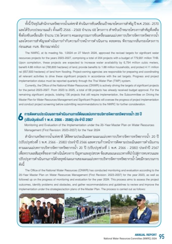%u0009 %u0e2a%u0e33%u0e19%u0e31%u0e31%u0e01%u0e07%u0e32%u0e19%u0e17%u0e23%u0e31%u0e31%u0e1e%u0e22%u0e32%u0e01%u0e23%u0e19%u0e49%u0e49%u0e33%u0e41%u0e2b%u0e48%u0e48%u0e07%u0e0a%u0e32%u0e15%u0e34%u0e34%u0e44%u0e14%u0e49%u0e49%u0e15%u0e34%u0e34%u0e14%u0e15%u0e32%u0e21%u0e1b%u0e23%u0e30%u0e40%u0e21%u0e34%u0e34%u0e19%u0e1c%u0e25%u0e15%u0e32%u0e21%u0e41%u0e1c%u0e19%u0e41%u0e21%u0e48%u0e48%u0e1a%u0e17%u0e01%u0e32%u0e23%u0e1a%u0e23%u0e34%u0e34%u0e2b%u0e32%u0e23%u0e08%u0e31%u0e31%u0e14%u0e01%u0e32%u0e23%u0e17%u0e23%u0e31%u0e31%u0e1e%u0e22%u0e32%u0e01%u0e23%u0e19%u0e49%u0e49%u0e3320%u0e1b%u0e35%u0e35(%u0e1b%u0e23%u0e31%u0e31%u0e1a%u0e1b%u0e23%u0e38%u0e38%u0e07%u0e0a%u0e48%u0e48%u0e27%u0e07%u0e17%u0e35%u0e48%u0e481%u0e1e.%u0e28.2566-2580) %u0e1b%u0e23%u0e30%u0e08%u0e33%u0e1b%u0e35%u0e352566%u0e41%u0e25%u0e30%u0e04%u0e27%u0e32%u0e21%u0e01%u0e49%u0e49%u0e32%u0e27%u0e2b%u0e19%u0e49%u0e49%u0e32%u0e01%u0e32%u0e23%u0e15%u0e34%u0e34%u0e14%u0e15%u0e32%u0e21%u0e1b%u0e23%u0e30%u0e40%u0e21%u0e34%u0e34%u0e19%u0e1c%u0e25%u0e01%u0e32%u0e23%u0e14%u0e33%u0e40%u0e19%u0e34%u0e34%u0e19%u0e07%u0e32%u0e19%u0e15%u0e32%u0e21%u0e41%u0e1c%u0e19%u0e41%u0e21%u0e48%u0e48%u0e1a%u0e17%u0e01%u0e32%u0e23%u0e1a%u0e23%u0e34%u0e34%u0e2b%u0e32%u0e23%u0e08%u0e31%u0e31%u0e14%u0e01%u0e32%u0e23%u0e17%u0e23%u0e31%u0e31%u0e1e%u0e22%u0e32%u0e01%u0e23%u0e19%u0e49%u0e49%u0e3320%u0e1b%u0e35%u0e35(%u0e1b%u0e23%u0e31%u0e31%u0e1a%u0e1b%u0e23%u0e38%u0e38%u0e07%u0e0a%u0e48%u0e48%u0e27%u0e07%u0e17%u0e35%u0e48%u0e48%ufffd1%u0e1e.%u0e28.2566-2580) %u0e1b%u0e23%u0e30%u0e08%u0e33%u0e1b%u0e35%u0e352567%u0e40%u0e1e%u0e37%u0e48%u0e48%ufffd%u0e2d%u0e17%u0e23%u0e32%u0e1a%u0e1c%u0e25%u0e2a%u0e31%u0e21%u0e31%u0e24%u0e17%u0e18%u0e34%u0e4c%u0e4c%u0e02%ufffd%u0e2d%u0e07%u0e01%u0e32%u0e23%u0e14%u0e33%u0e40%u0e19%u0e34%u0e34%u0e19%u0e42%u0e04%u0e23%u0e07%u0e01%u0e32%u0e23 %u0e1b%u0e31%u0e31%u0e0d%u0e2b%u0e32%u0e41%u0e25%u0e30%u0e2d%u0e38%u0e1b%u0e38%u0e2a%u0e23%u0e23%u0e04 %u0e02%u0e49%u0e49%u0e2d%u0e40%u0e2a%u0e19%u0e2d%u0e41%u0e19%u0e30%u0e41%u0e19%u0e27%u0e17%u0e32%u0e07%u0e17%u0e35%u0e48%u0e48%ufffd%u0e19%u0e33%u0e44%u0e1b%u0e2a%u0e39%u0e48%u0e48%u0e01%u0e32%u0e23%u0e17%u0e1a%u0e17%u0e27%u0e19%u0e41%u0e25%u0e30%u0e1b%u0e23%u0e31%u0e1a%u0e31%u0e1b%u0e23%u0e38%u0e38%u0e07%u0e01%u0e32%u0e23%u0e14%u0e33%u0e40%u0e19%u0e34%u0e19%u0e07%u0e32%u0e19%u0e20%u0e32%u0e22%u0e43%u0e34%u0e15%u0e49%u0e49%u0e01%u0e25%u0e22%u0e38%u0e17%u0e38%u0e18%u0e4c/%u0e41%u0e1c%u0e19%u0e07%u0e32%u0e19%u0e4c%u0e02%u0e2d%u0e07%u0e41%u0e1c%u0e19%u0e41%u0e21%u0e48%u0e48%u0e1a%u0e17%u0e01%u0e32%u0e23%u0e1a%u0e23%u0e34%u0e2b%u0e32%u0e23%u0e34%u0e08%u0e31%u0e14%u0e01%u0e32%u0e23%u0e17%u0e31%u0e23%u0e31%u0e31%u0e1e%u0e22%u0e32%u0e01%u0e23%u0e19%u0e49%u0e33%u0e49%u0e42%u0e14%u0e22%u0e21%u0e35%u0e35%u0e01%u0e23%u0e30%u0e1a%u0e27%u0e19%u0e01%u0e32%u0e23%u0e14%u0e31%u0e31%u0e07%u0e19%u0e35%u0e49%u0e49%u0e01%u0e32%u0e23%u0e15%u0e34%u0e14%u0e15%u0e32%u0e21%u0e1b%u0e23%u0e30%u0e40%u0e21%u0e34%u0e19%u0e1c%u0e25%u0e01%u0e32%u0e23%u0e14%u0e33%u0e40%u0e19%u0e34%u0e19%u0e07%u0e32%u0e19%u0e20%u0e32%u0e22%u0e43%u0e15%u0e49%u0e41%u0e1c%u0e19%u0e41%u0e21%u0e48%u0e1a%u0e17%u0e01%u0e32%u0e23%u0e1a%u0e23%u0e34%u0e2b%u0e32%u0e23%u0e08%u0e31%u0e14%u0e01%u0e32%u0e23%u0e17%u0e23%u0e31%u0e1e%u0e22%u0e32%u0e01%u0e23%u0e19%u0e49%u0e33 20 %u0e1b%u0e356(%u0e1b%u0e23%u0e31%u0e1a%u0e1b%u0e23%u0e38%u0e07%u0e0a%u0e48%u0e27%u0e07%u0e17%u0e35%u0e48 1 %u0e1e.%u0e28. 2566 - 2580) %u0e1b%u0e23%u0e30%u0e08%u0e33%u0e1b%u0e35 2567Monitoring and Evaluation of the Implementation under the 20-Year Master Plan on Water Resources Management (First Revision: 2023-2037) for the Year 2024The NWRC, at its meeting No. 1/2024 on 27 March 2024, approved the revised targets for significant waterresources projects for the years 2023-2027, comprising a total of 204 projects with a budget of 779,991 million THB. Upon completion, these projects are expected to increase water availability by 6,794 million cubic meters,benefit 4.88 million rai (780,800 hectares) of land, provide benefits to 1.88 million households, and protect 4.11 million rai (657,600 hectares) of land from flooding. Project-owning agencies are responsible for preparing and coordinatingall relevant activities to drive these significant projects in accordance with the set targets. Progress and project implementation status must be reported quarterly through the Thai Water Plan (TWP) system.Currently, the Office of the National Water Resources (ONWR) is actively driving the targets of significant projectsfor the period 2023-2027. From 2023 to 2025, a total of 68 projects has already received budget approval. For the remaining significant projects, totaling 136 projects that still require implementation, the Subcommittee on Driving the Master Plan for Water Resources Management and Significant Projects will oversee the progress of project implementationand conduct project screening before submitting recommendations to the NWRC for further consideration.The Office of the National Water Resources (ONWR) has conducted monitoring and evaluation according to the 20-Year Master Plan on Water Resources Management (First Revision: 2023-2037) for the year 2023, as well as followed up on the progress of monitoring and evaluation for the year 2024. This process aims to assess the project outcomes, identify problems and obstacles, and gather recommendations and guidelines to review and improve the implementation under the strategies/action plans of the Master Plan. The process is carried out as follows:%u0e17%u0e31%u0e49%u0e49%u0e07%u0e17%u0e31%u0e49%u0e49%u0e19%u0e35%u0e49%u0e49 %u0e1b%u0e31%u0e31%u0e08%u0e08%u0e38%u0e1a%u0e31%u0e38%u0e31%u0e19%u0e2a%u0e33%u0e19%u0e31%u0e31%u0e01%u0e07%u0e32%u0e19%u0e17%u0e23%u0e31%u0e31%u0e1e%u0e22%u0e32%u0e01%u0e23%u0e19%u0e49%u0e49%u0e33%u0e41%u0e2b%u0e48%u0e48%u0e07%u0e0a%u0e32%u0e15%u0e34%u0e34%u0e14%u0e33%u0e40%u0e19%u0e34%u0e34%u0e19%u0e01%u0e32%u0e23%u0e02%u0e31%u0e31%u0e1a%u0e40%u0e04%u0e25%u0e37%u0e48%u0e48%ufffd%u0e2d%u0e19%u0e40%u0e1b%u0e49%u0e49%u0e32%u0e2b