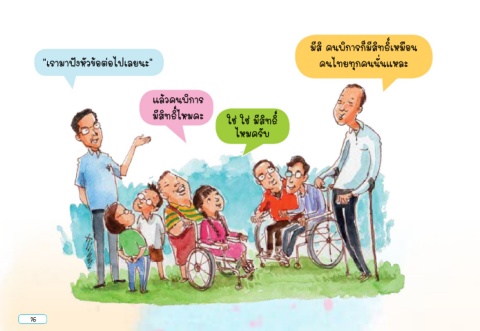 มีสิ คนพิการก็มีสิทธิ์เหมือน “เรามาฟังหัวข้อต่อไปเลยนะ” คนไทยทุกคนนั่นแหละ แล้วคนพิการ มีสิทธิ์ไหมคะ ใช่ ใช่ มีสิทธิ์ ไหมครับ 16