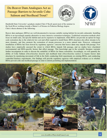 focus on small scale, site-specific habitat and can be expensive to implement, while BDAs can provide an option for large scale restoration due to the relatively low cost and effort required to install them. BDA structures also allow streams to be more dynamic, and they promote the restoration of stream processes to a more natural state. However, widespread installation of BDAs has been slowed by regulatory agencies’ concerns that beaver dams may impede fish passage. Few studies have empirically assessed the extent to which BDAs impede fish passage, and no studies have elucidated environmental and BDA-specific factors that affect passage. This knowledge gap in the scientific literature warrants further investigation in order to discern the suitability of BDAs for future restoration. Accordingly, we will quantify the ability of Coho Salmon (Oncorhynchus kisutch) and steelhead trout (Oncorhynchus mykiss) to bypass beaver dam structures by monitoring movement of fish in the field, conducting field experiments on existing BDAs, and conducting controlled hatchery experiments. Our findings will provide regulatory agencies with empirical evidence as to whether BDAs prevent coho and steelhead passage in order to inform permitting and implementation.