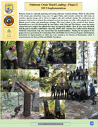 Patterson Creek Wood Loading - Phase II 2019 Implementation Patterson Creek is a salmonid spawning and rearing cold-water westside tributary. While the alluvial fan of the stream goes subsurface every year, it’s upper Valley reach remains wetted, has cold water, an extensive riparian canopy and is known to support coho and steelhead rearing. The confinement and increased velocities have reduced the ecological services that stream can offer, with reduced slow water habitat, gravel sorting and groundwater recharge. This year’s phase is the second of three phases. Streamside trees were fell directionally by local fallers, Andy Dean and Tim Murray, across the stream channel and were wedged into adjacent live trees for improved stability. Most all trees were left whole with the goal to minimize mobilization. Once fell, SRWC staff, volunteer Ken Collins and the Siskiyou California Conservation Corp crew moved them into desired locations. Funding for two phases of this project has been provided by the United States Fish and Wildlife Service Partners Program and third phase (scheduled for implementation in 2020) has been funded by the Bureau of Reclamation which is administrated by the National Fish and Wildlife Foundation. 11 www.ScottRiverWatershedCouncil.com