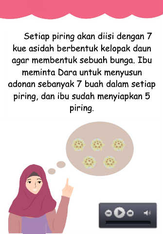 Setiap piring akan diisi dengan 7 kue asidah berbentuk kelopak daun agar membentuk sebuah bunga. Ibu meminta Dara untuk menyusun adonan sebanyak 7 buah dalam setiap piring, dan ibu sudah menyiapkan 5 piring.