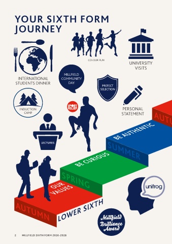 YOUR SIXTH FORM JOURNEY COLOUR RUN UNIVERSITY VISITS MILLFIELD INTERNATIONAL COMMUNITY STUDENTS DINNER DAY PREFECT SELECTION BE KIND INDUCTION PERSONAL CAMP STATEMENT BE AUTHENTIC LECTURES BE CURIOUS OUR VALUES 2 MILLFIELD SIXTH FORM 2026-2028
