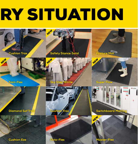 RY SITUATION Cushion Trax Safety Stance Solid Posture Mat Sani-Flex Sky Step Nitrile Super Flow Diamond Sof Tred Cushion Trax Switchboard Matting Cushion Eze Octo-Flex Master-Flex 3 NEW NEW NEW NEW NEW