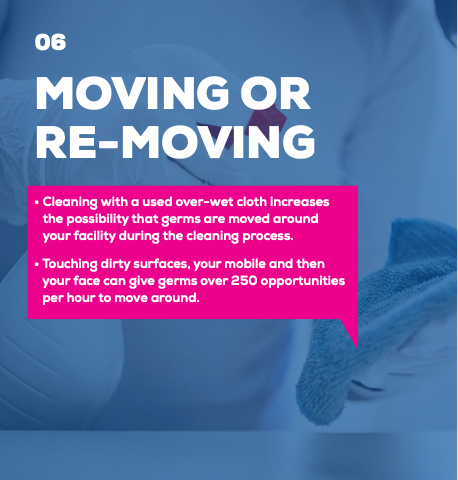 • Cleaning with a used over-wet cloth increases the possibility that germs are moved around your facility during the cleaning process.