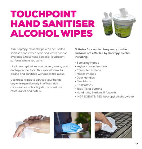 75% Isopropyl alcohol wipes can be used to sanitise hands when soap and water are not available & to sanitise personal Touchpoint surfaces where you work.