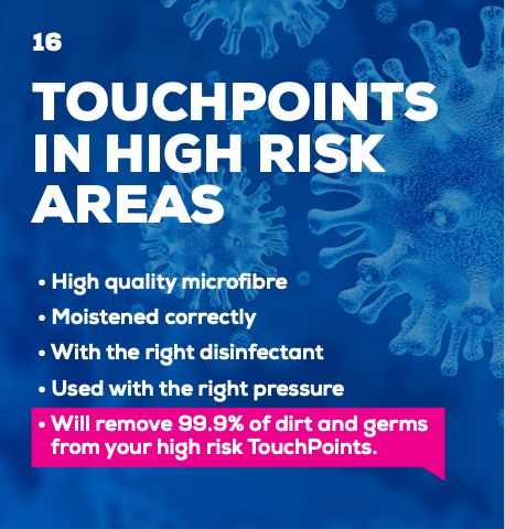 16 TOUCHPOINTS IN HIGH RISK AREAS • High quality microfibre • Moistened correctly • With the right disinfectant • Used with the right pressure • Will remove 99.9% of dirt and germs from your high risk TouchPoints. 16