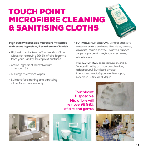 • Highest quality Ready-To-Use Microfibre wipes for removing 99.9% of dirt & germs from your Facility Touchpoint surfaces