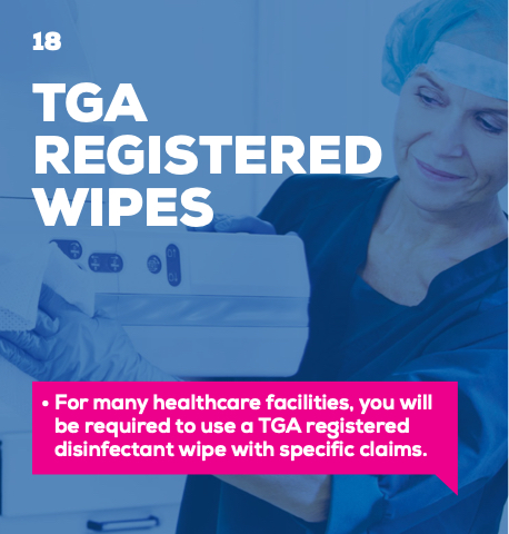 • For many healthcare facilities, you will be required to use a TGA registered disinfectant wipe with specific claims.