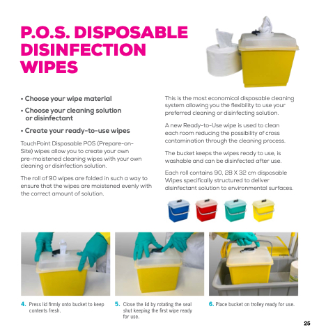 TouchPoint Disposable POS (Prepare-on- Site) wipes allow you to create your own pre-moistened cleaning wipes with your own cleaning or disinfection solution.