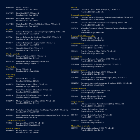 00135084 Vouvray White (2015) · 750 mL × 12 Frontline $9 50 50 | Case $114 00 00043134 00043104 00043114 00043124
