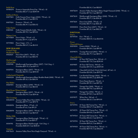 Awatere Valley Pinot Noir (2015) · 750 mL × 12 Frontline $15 97 | Case $191 70 Sauvignon Blanc · 375 mL × 12 Frontline $7 61 | Case $91 29 Sauvignon Blanc (2017) · 750 mL × 12 Frontline $13 68 | Case $164 10 Sauvignon Blanc Marlborough · 750 mL × 12 Frontline $9 95