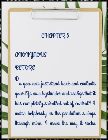 CHAPTER 5 ANONYMOUS BEFORE D o you ever just stand back and evaluate your life as a bystander and realize that it has completely spiralled out of control? I watch helplessly as the pendulum swings through mine. I move the way it rocks
