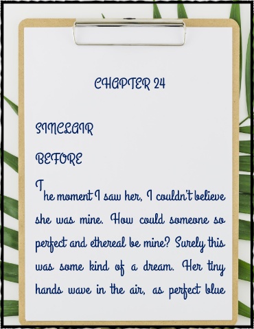 CHAPTER 24 SINCLAIR BEFORE T he moment I saw her, I couldn’t believe she was mine. How could someone so perfect and ethereal be mine? Surely this was some kind of a dream. Her tiny hands wave in the air, as perfect blue