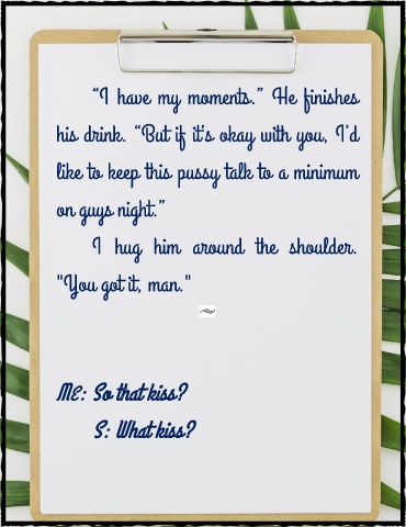 “I have my moments.” He finishes his drink. “But if it’s okay with you, I’d like to keep this pussy talk to a minimum on guys night.” I hug him around the shoulder. "You got it, man." ME: So that kiss? S: What kiss?
