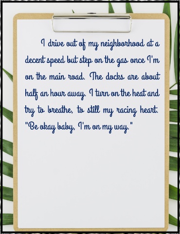 I drive out of my neighborhood at a decent speed but step on the gas once I'm on the main road. The docks are about half an hour away. I turn on the heat and try to breathe, to still my racing heart. "Be okay baby, I'm on my way."