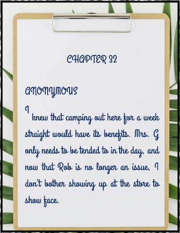 CHAPTER 32 ANONYMOUS I knew that camping out here for a week straight would have its benefits. Mrs. G only needs to be tended to in the day, and now that Rob is no longer an issue, I don’t bother showing up at the store to show face.