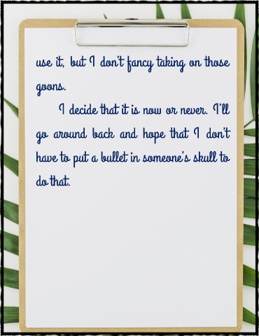 use it, but I don’t fancy taking on those goons. I decide that it is now or never. I’ll go around back and hope that I don’t have to put a bullet in someone’s skull to do that.