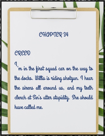CHAPTER 34 CREED I 'm in the first squad car on the way to the docks. Willis is riding shotgun. I hear the sirens all around us, and my teeth clench at Sin's utter stupidity. She should have called me.