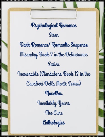 Psychological Romance Siren Dark Romance/ Romantic Suspense Misandry Book 2 in the Deliverance Series Inexorable (Standalone Book 12 in the Cavalieri Della Morte Series) Novellas Inevitably Yours The Cure Anthologies