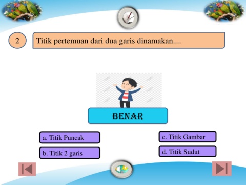 2 Titik pertemuan dari dua garis dinamakan.... BSeanlaahr a. Titik Puncak c. Titik Gambar b. Titik 2 garis d. Titik Sudut