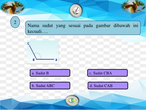 2 Nama sudut yang sesuai pada gambar dibawah ini kecuali…. a. Sudut B c. Sudut CBA b. Sudut ABC d. Sudut CAB