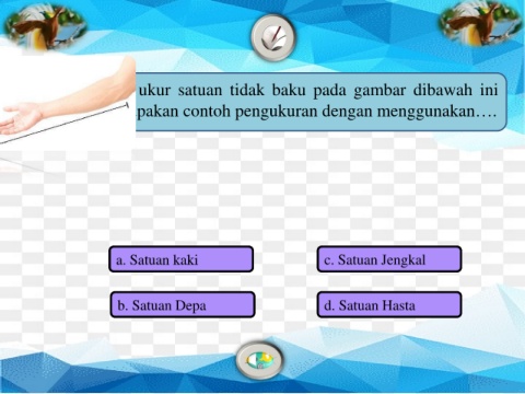 5 Alat ukur satuan tidak baku pada gambar dibawah ini merupakan contoh pengukuran dengan menggunakan…. a. Satuan kaki c. Satuan Jengkal b. Satuan Depa d. Satuan Hasta