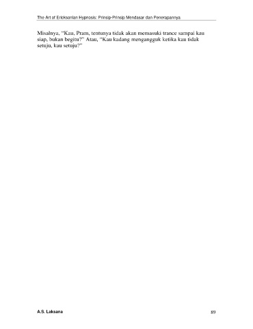 The Art of Ericksonian Hypnosis: Prinsip-Prinsip Mendasar dan Penerapannya Misalnya, “Kau, Pram, tentunya tidak akan memasuki trance sampai kau siap, bukan begitu?” Atau, “Kau kadang mengangguk ketika kau tidak setuju, kau setuju?” A.S. Laksana 89