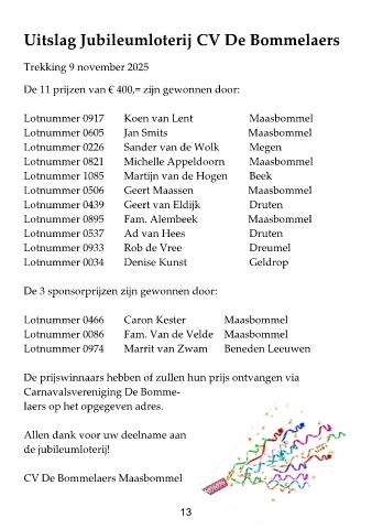 De 11 prijzen van € 400,= zijn gewonnen door: