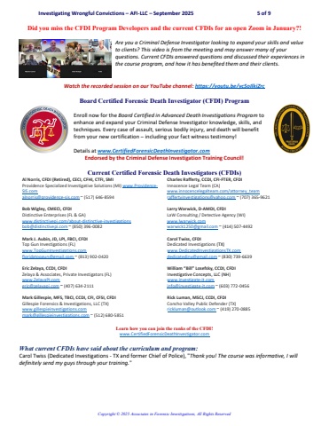 Investigating Wrongful Convictions%u2013AFI-LLC %u2013September 20255of 9Copyright %u00a9 2025Associates in Forensic Investigations, All Rights ReservedDid you missthe CFDI Program Developers and the current CFDIs for an open Zoomin January?!Are you a Criminal Defense Investigator looking to expand your skills and value to clients? This video is from the meeting and may answer many of your questions. Current CFDIs answered questions and discussed their experiences in the course program, and how it has benefited them and their clients.Watch the recorded session on our YouTube channel:https://youtu.be/yc5oIlkiZrcBoard Certified Forensic Death Investigator (CFDI) ProgramEnroll now for the Board Certified in Advanced Death Investigations Program to enhance and expand your Criminal Defense Investigator knowledge, skills, and techniques. Every case of assault, serious bodily injury, and death will benefit from your new certification including your fact witness testimony!Details at www.CertifiedForensicDeathInvestigator.comEndorsed bythe Criminal Defense Investigation Training Council!Current Certified Forensic Death Investigators (CFDIs)Al Norris, CFDI(Retired), CECI, CFHI, CTFI, SMIProvidence Specialized Investigative Solutions (MI)www.ProvidenceSIS.comalnorris@providence-sis.com~ (517) 646-8594Charles Rafferty, CCDI, CFI-FTER, CFDIInnocence Legal Team (CA)www.innocencelegalteam.com/attorney_teamraffertyinvestigations@yahoo.com~ (707) 365-9621Bob Wigley, CMECI, CFDIDistinctive Enterprises (FL & GA)www.distinctivepi.com/about-distinctive-investigationsbob@distinctivepi.com~ (850) 396-0082Larry Warwick, D-AMDI, CFDILaW Consulting / Detective Agency (WI)www.lwarwick.comwarwick1250@gmail.com~ (414) 507-4492Mark J. Aubin, JD, LPI, FBCI, CFDITop Gun Investigations (FL)www.TopGunInvestigations.comfloridatopgun@gmail.com~(813) 902-0420Carol Twiss, CFDIDedicated Investigations (TX)www.DedicatedInvestigationsTX.comdedicatedinv@gmail.com~ (830) 739-6639Eric Zelaya, CCDI, CFDIZelaya & Associates, Private Investigators (FL)www.ZelayaPI.comeric@zelayapi.com~ (407) 634-2111William %u201cBill%u201d Losefsky, CCDI, CFDIInvestigative Concepts, LLC(NH)www.investigate-it.cominfo@investigate-it.com~ (603) 772-0456Mark Gillespie, MFS, TBCI, CCDI, CFI, CFSI, CFDIGillespie Forensics & Investigations, LLC (TX)www.gillespieinvestigations.commark@gillespieinvestigations.com~ (512) 680-5851Rick Luman, MSCJ, CCDI, CFDIConcho Valley Public Defender (TX)rickluman@outlook.com~ (419) 270-0885Learn how you can join the ranks of the CFDI!www.CertifiedForensicDeathInvestigator.comWhat current CFDIs have said about the curriculum and program:Carol Twiss (Dedicated Investigations -TX and former Chief of Police), \ormative,I will definitely send my guys through your training.\