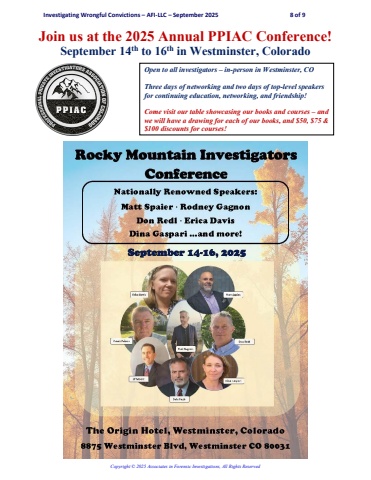 Investigating Wrongful Convictions%u2013AFI-LLC %u2013September 20258of 9Copyright %u00a9 2025Associates in Forensic Investigations, All Rights ReservedJoin us at the 2025 Annual PPIACConference!September 14thto16thin Westminster, ColoradoOpen to all investigators %u2013in-person in Westminster, COThree days of networking and twodays of top-level speakers for continuing education, networking, and friendship!Come visit our tableshowcasing our books and courses %u2013and we will have adrawingfor each of our books, and $50, $75 & $100 discounts for courses!