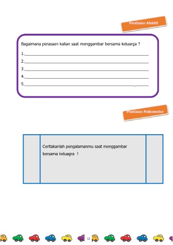 Penilaian Afektif Bagaimana perasaan kalian saat menggambar bersama keluarga ? 1. _ 2. _ 3. _ 4. _ 5. _ Penilaian Psikomotor Ceritakanlah pengalamanmu saat menggambar bersama keluagra ! 11