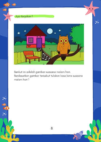Ayo Kerjakan ! Berikut ini adalah gambar suasana malam hari. Berdasarkan gambar tersebut tuliskan kosa kata suasana malam hari ! 8
