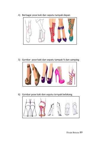 4) Berbagai pose kaki dan sepatu tampak depan 5) Gambar pose kaki dan sepatu tampak ¾ dan samping 6) Gambar pose kaki dan sepatu tampak belakang Disain Busana 89