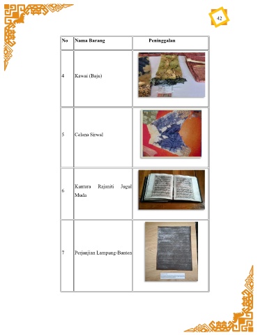 42 No Nama Barang Peninggalan 4 Kawai (Baju) 5 Celana Sirwal Kuntara Rajaniti Jugul 6 Muda 7 Perjanjian Lampung-Banten