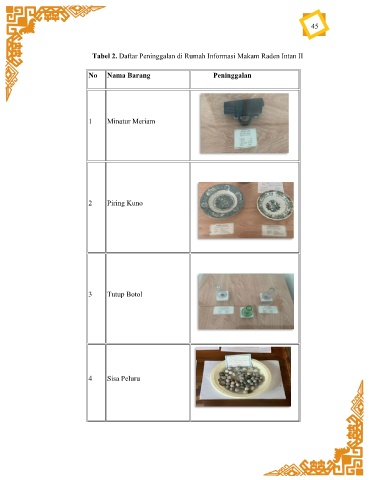 45 Tabel 2. Daftar Peninggalan di Rumah Informasi Makam Raden Intan II No Nama Barang Peninggalan 1 Minatur Meriam 2 Piring Kuno 3 Tutup Botol 4 Sisa Peluru