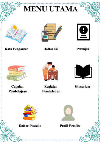 MENU UTAMA Kata Pengantar Daftar Isi Petunjuk Capaian Kegiatan Glosarium Pembelajran Pembelajran Daftar Pustaka Profil Penulis