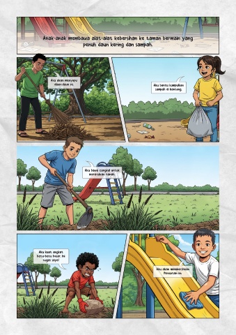 Anak-anak membawa alat-alat kebersihan ke taman bermain yang