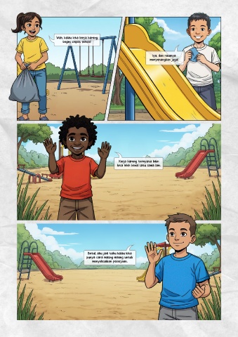 Wah, kalau kita kerja bareng begini, cepat selesai! Iya, dan rasanya menyenangkan juga! Kerja bareng ternyata bikin kita lebih kenal satu sama lain. Betul, aku jadi tahu kalau kita punya cara masing-masing untuk menyelesaikan pekerjaan.