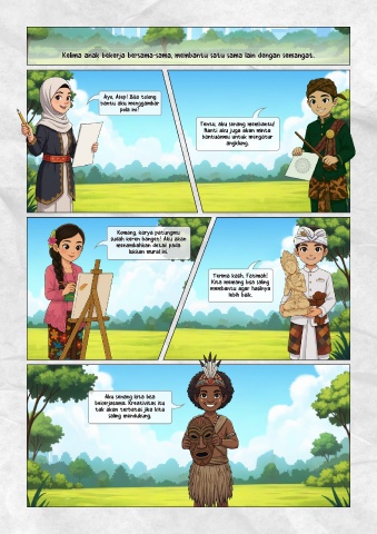 Kelima anak bekerja bersama-sama, membantu satu sama lain dengan semangat.