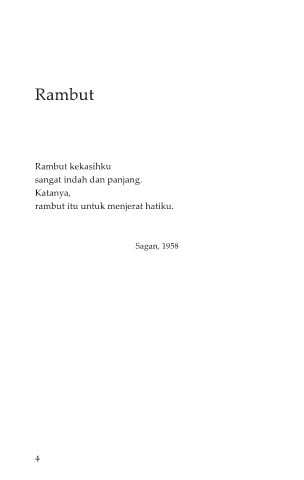 Rambut Rambut kekasihku sangat indah dan panjang. Katanya, rambut itu untuk menjerat hatiku. Sagan, 1958 4