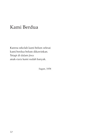 Kami Berdua Karena sekolah kami belum selesai kami berdua belum dikawinkan. Tetapi di dalam jiwa anak-cucu kami sudah banyak. Sagan, 1958 10