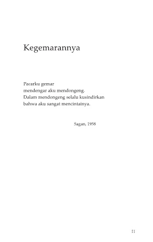 Kegemarannya Pacarku gemar mendengar aku mendongeng. Dalam mendongeng selalu kusindirkan bahwa aku sangat mencintainya. Sagan, 1958 11