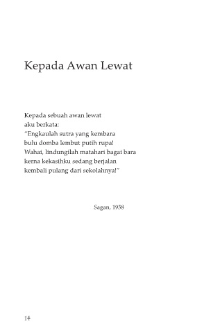Kepada Awan Lewat Kepada sebuah awan lewat aku berkata: “Engkaulah sutra yang kembara bulu domba lembut putih rupa! Wahai, lindungilah matahari bagai bara kerna kekasihku sedang berjalan kembali pulang dari sekolahnya!” Sagan, 1958 14