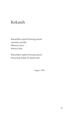 Kekasih Kekasihku seperti burung murai suaranya merdu. Matanya kaca hatinya biru. Kekasihku seperti burung murai bersarang indah di dalam hati. Sagan, 1958 23