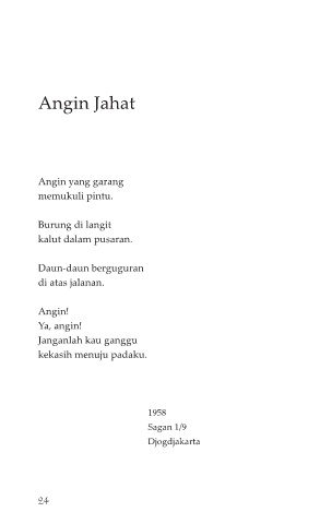 Angin Jahat Angin yang garang memukuli pintu. Burung di langit kalut dalam pusaran. Daun-daun berguguran di atas jalanan. Angin! Ya, angin! Janganlah kau ganggu kekasih menuju padaku. 1958 Sagan 1/9 Djogdjakarta 24
