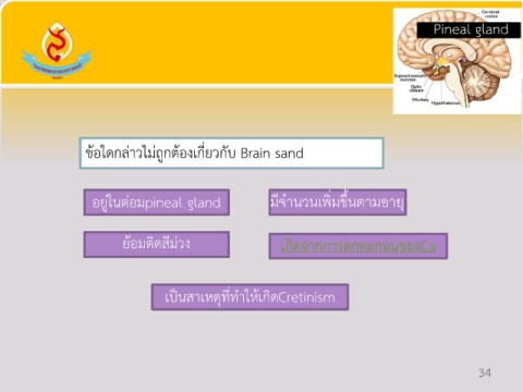 Pineal gland ข้อใดกล่าวไม่ถูกต้องเกี่ยวกับ Brain sand ี ่ อยู่ในต่อมpineal gland มจ ำนวนเพิมขึ้นตำมอำยุ ย้อมติดสีม่วง เกิดจากการตกตะกอนของCa เป็นสาเหตุที่ท าให้เกิดCretinism 34