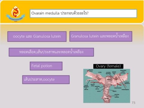 Ovarain medulla ประกอบด้วยอะไร? oocyte และ Glanulosa lutein Granulosa lutein และหลอดน ้าเหลือง หลอดเลือด,เส้นประสาทและหลอดน ้าเหลือง Fetal potion Ovary (female) เส้นประสาท,oocyte 75 75