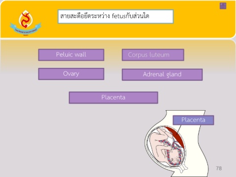 สายสะดือยึดระหว่าง fetusกับส่วนใด Peluic wall Corpus luteum Ovary Adrenal gland Placenta Placenta 78 78 CC BY-SA
